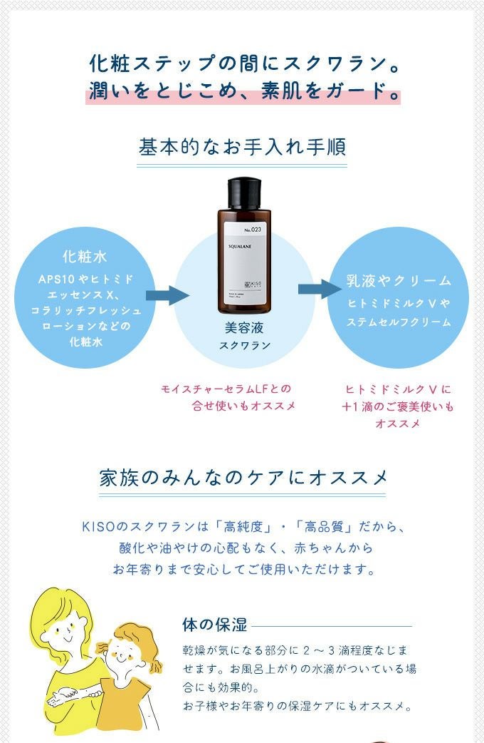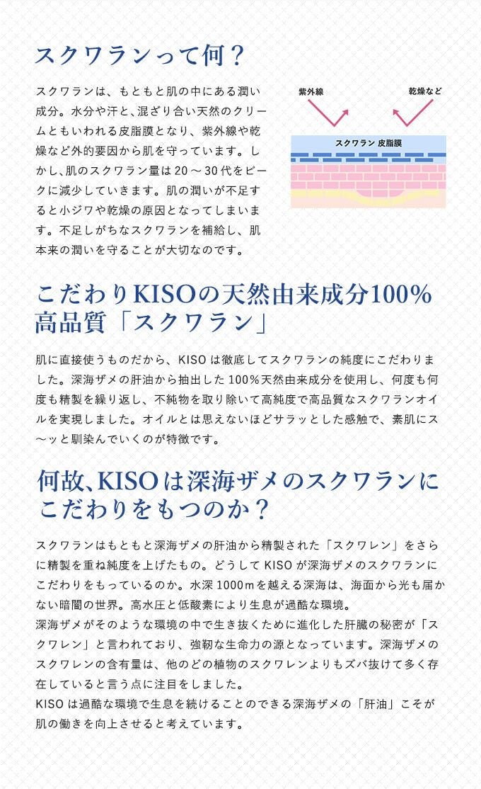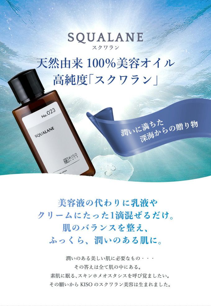 他の画像を見る 肌のバランスを整え、ふっくら、潤いのある肌に 【会員様限定 10%OFF】KISOCARE スクワラン100%美容オイル キソスクワランオイル 50ml No.023 販売価格 ¥ 1,065 税込 会員価格あり 会員特別価格 ¥ 959 税込 カートに入れる お気に入りに登録する