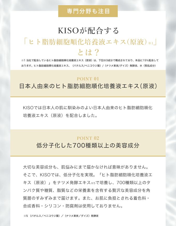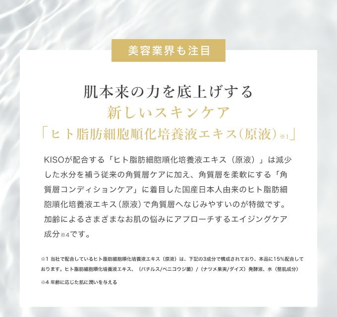 他の画像を見る 肌本来の力を底上げする新しいスキンケア KISOCARE ヒト幹細胞順化培養液原液5%配合化粧水 キソ ステムセルフローション 120ml No.046 販売価格 ¥ 3,131 税込 会員価格あり 会員特別価格 ¥ 2,818 税込 カートに入れる お気に入りに登録する