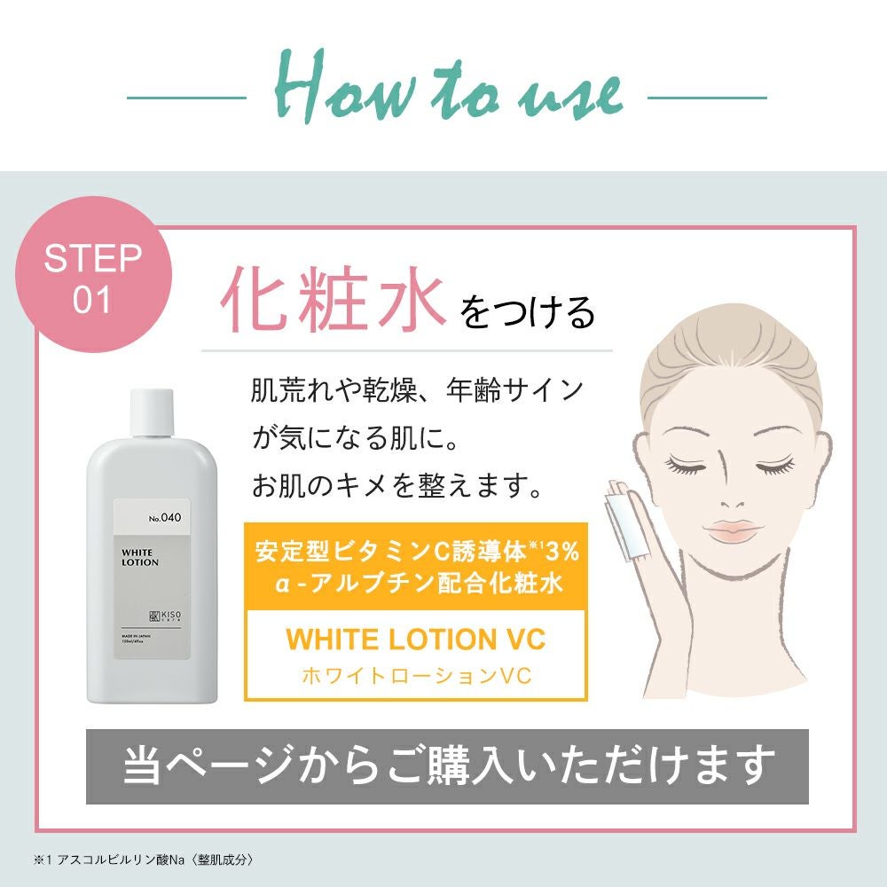 他の画像を見る 肌荒れや乾燥、年齢サインが気になる肌に 【会員様限定 57%OFF】KISOCARE ビタミンC誘導体3% アルブチン配合化粧水 キソ ホワイトローション VC 120ml No.040 敏感肌用 イオン導入 販売価格 ¥ 3,870 税込 会員価格あり 会員特別価格 ¥ 1,680 税込 カートに入れる お気に入りに登録する