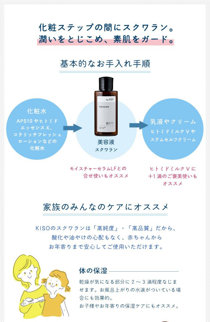 他の画像を見る 肌のバランスを整え、ふっくら、潤いのある肌に 【会員様限定 10%OFF】KISOCARE スクワラン100%美容オイル キソスクワランオイル 50ml No.023 販売価格 ¥ 1,065 税込 会員価格あり 会員特別価格 ¥ 959 税込 カートに入れる お気に入りに登録する